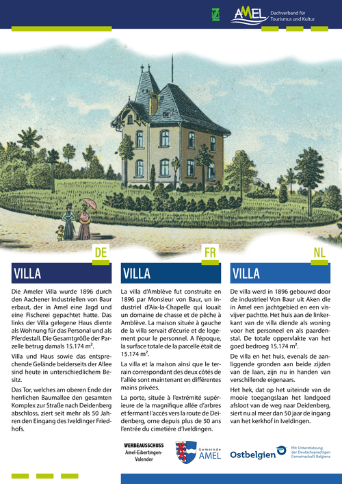 AmelDie Ameler Villa wurde 1896 durch den Aachener Industriellen von Baur erbaut, der in Amel eine Jagd und eine Fischerei gepachtet hatte. Das links der Villa gelegene Haus diente als Wohnung für das Personal und als Pferdestall. Die Gesamtgröße der Parzelle betrug damals 15.174 m².