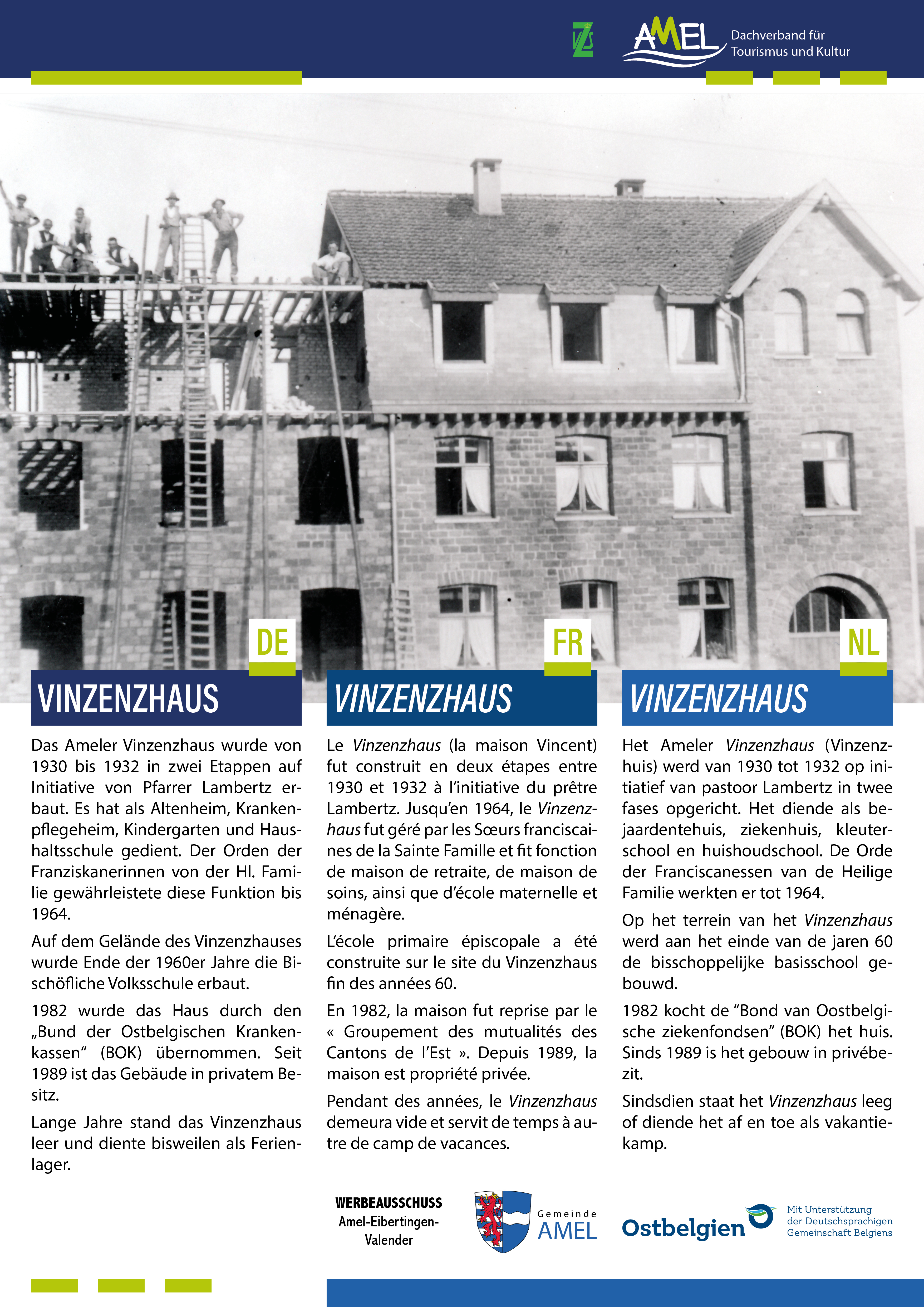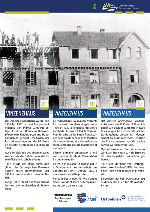 AmelDas Ameler Vinzenzhaus wurde von 1930 bis 1932 in zwei Etappen auf Initiative von Pfarrer Lambertz erbaut. Es hat als Altenheim, Krankenpflegeheim, Kindergarten und Haushaltsschule gedient. Der Orden der Franziskanerinnen von der Hl. Familie gewährleistete diese Funktion bis 1964.