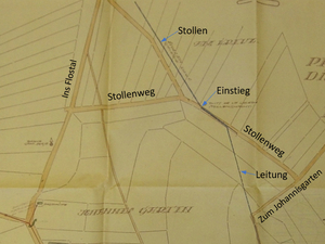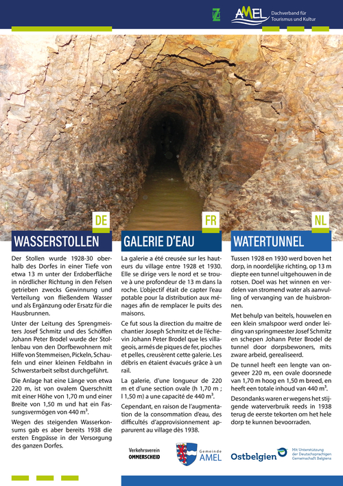 HerresbachDer Stollen wurde 1928-30 oberhalb des Dorfes in einer Tiefe von ca. 13 m unter der Erdoberfläche in nördlicher Richtung in den Felsen getrieben zwecks Gewinnung und Verteilung von fließendem Wasser und als Ergänzung oder Ersatz für die Hausbrunnen.
