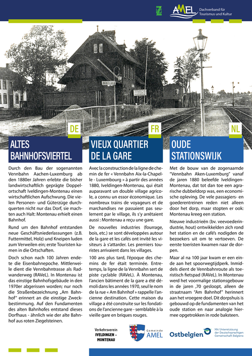 MontenauWohl kaum eine Entscheidung hat das Leben in der kleinen Eifelortschaft Montenau so sehr beflügelt, wie die Option, die Eisenbahnverbindung von Sankt Vith nach Weismes durch unsere Doppelortschaft zu verlegen und in Montenau einen Bahnhof zu errichten. Montenau erwachte nunmehr aus dem Dornröschenschlaf.