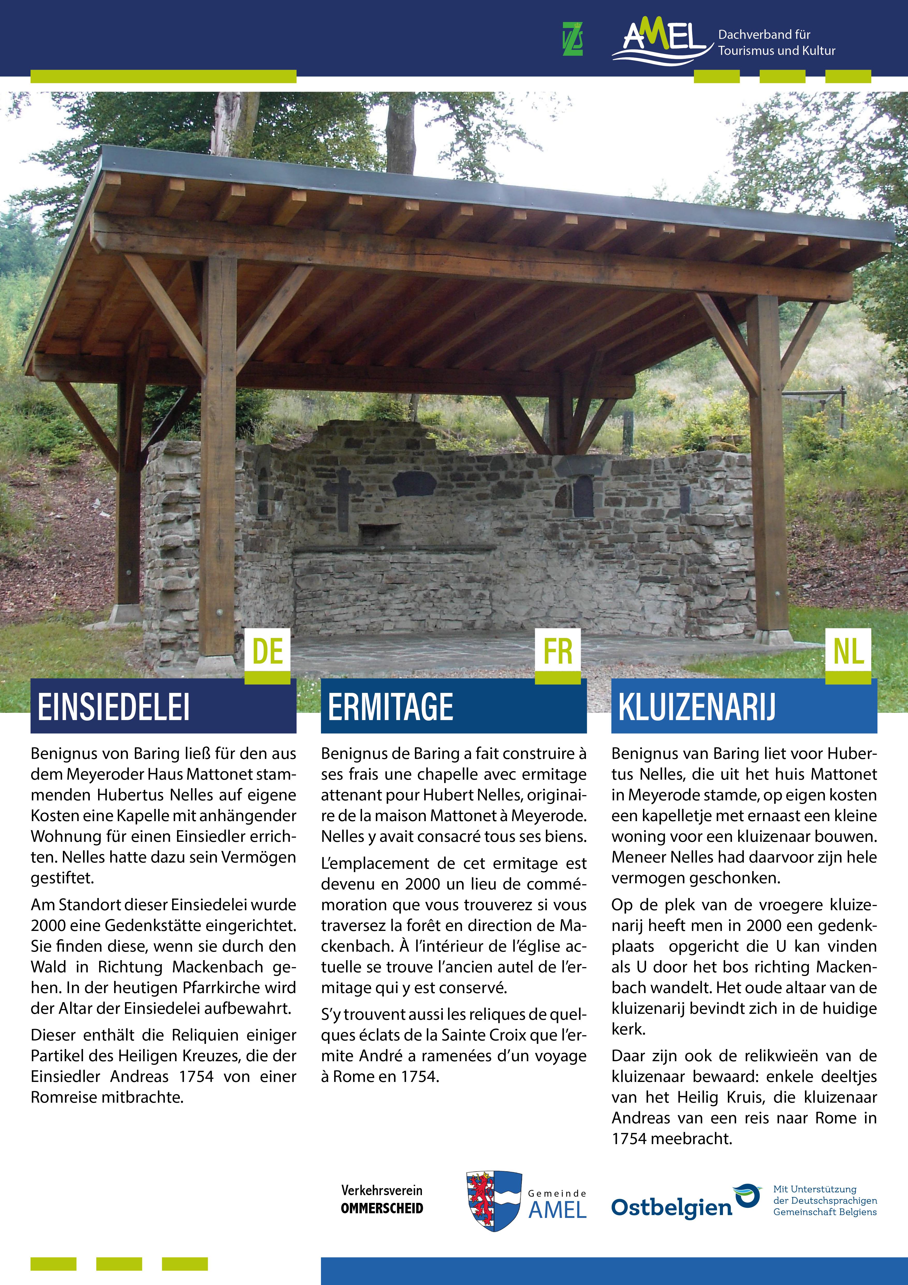 Am Standort dieser Einsiedelei wurde 2000 eine Gedenkstätte eingerichtet. Sie finden diese, wenn sie durch den Wald in Richtung Mackenbach gehen. In der heutigen Pfarrkirche wird der Altar der Einsiedelei aufbewahrt.