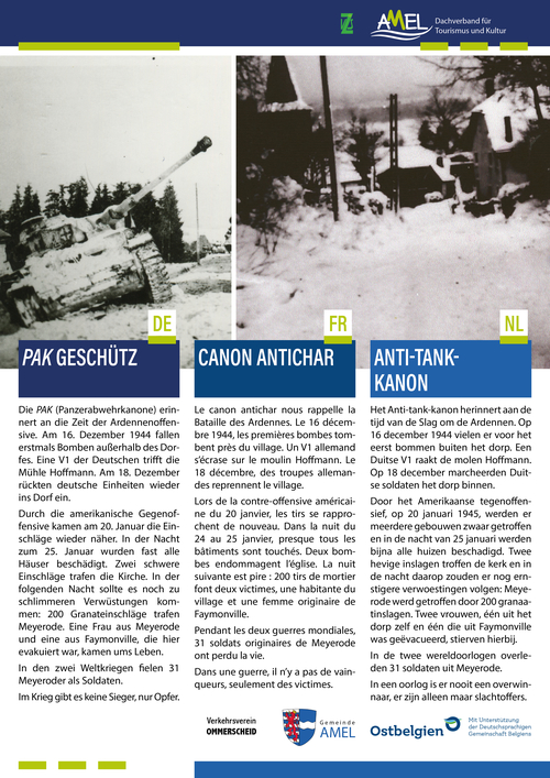 MeyerodeDie PAK (Panzerabwehrkanone) erinnert an die Zeit der Ardennenoffensive. Am 16. Dezember 1944 fallen erstmals Bomben außerhalb des Dorfes. Eine V1 der Deutschen trifft die Mühle Hoffmann. Am 18. Dezember rückten deutsche Einheiten wieder ins Dorf ein.