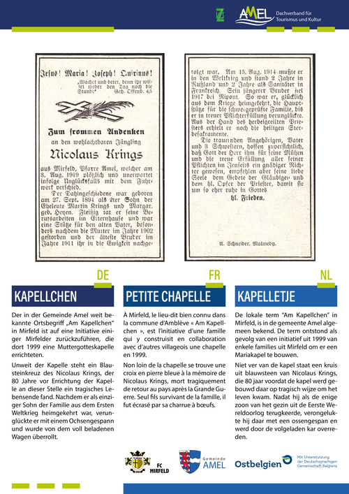 MirfeldDer in der Gemeinde Amel weit bekannte Ortsbegriff „Am Kapellchen“ in Mirfeld ist auf eine Initiative einiger Mirfelder zurückzuführen, die dort 1999 eine Muttergotteskapelle errichteten.