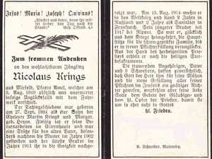 Unweit der Kapelle steht ein Blausteinkreuz des Nicolaus Krings, der 80 Jahre vor Errichtung der Kapelle an dieser Stelle ein tragisches Lebensende fand. Nachdem er als einziger Sohn der Familie aus dem Ersten Weltkrieg heimgekehrt war, verunglückte er mit einem Ochsengespann und wurde von dem voll beladenen Wagen überrollt.