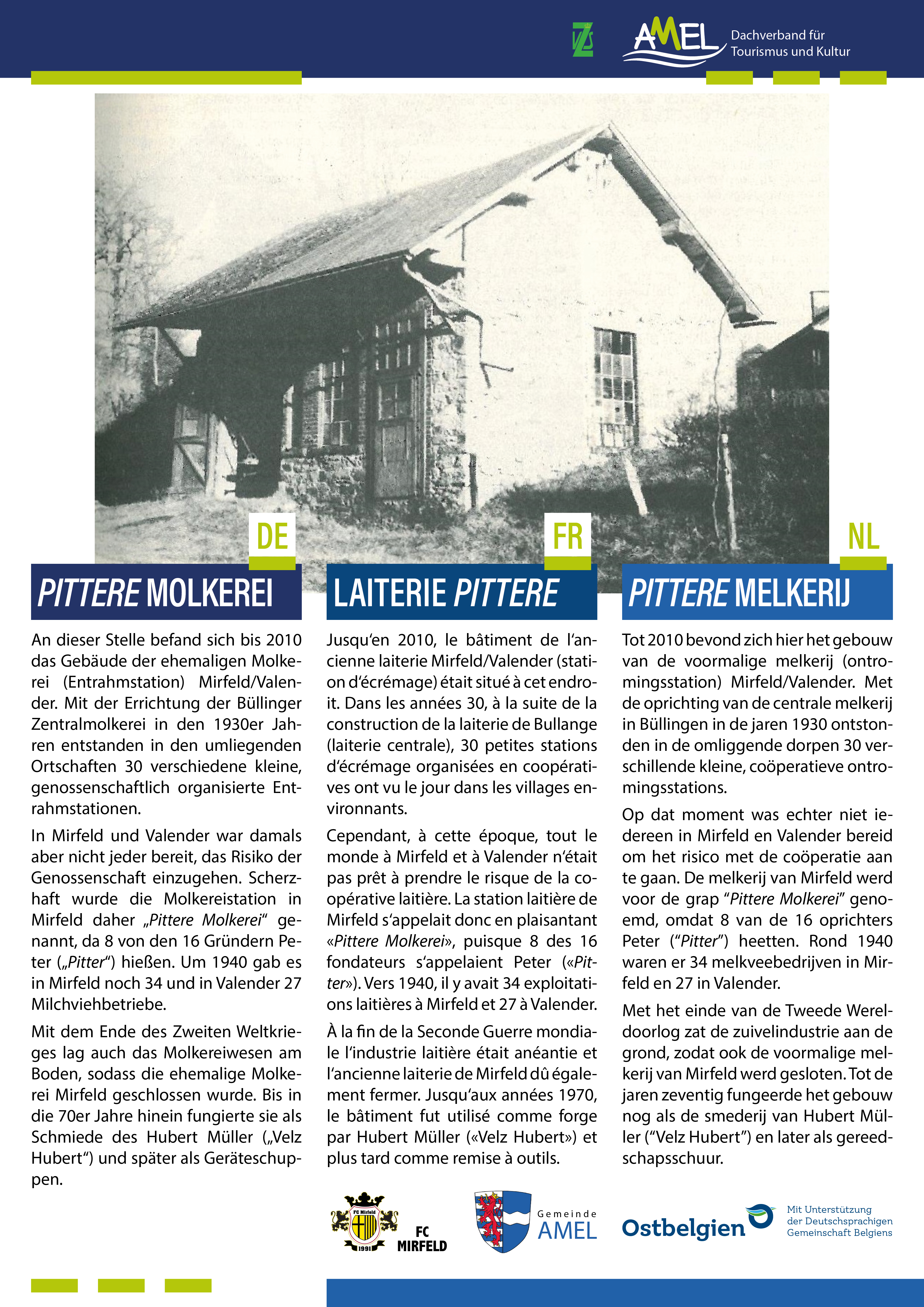 MirfeldAn dieser Stelle befand sich bis 2010 das Gebäude der ehemaligen Molkerei (Entrahmstation) Mirfeld/Valender. Mit der Errichtung der Büllinger Zentralmolkerei in den 1930er Jahren entstanden in den umliegenden Ortschaften 30 verschiedene kleine, genossenschaftlich organisierte Entrahmstationen.