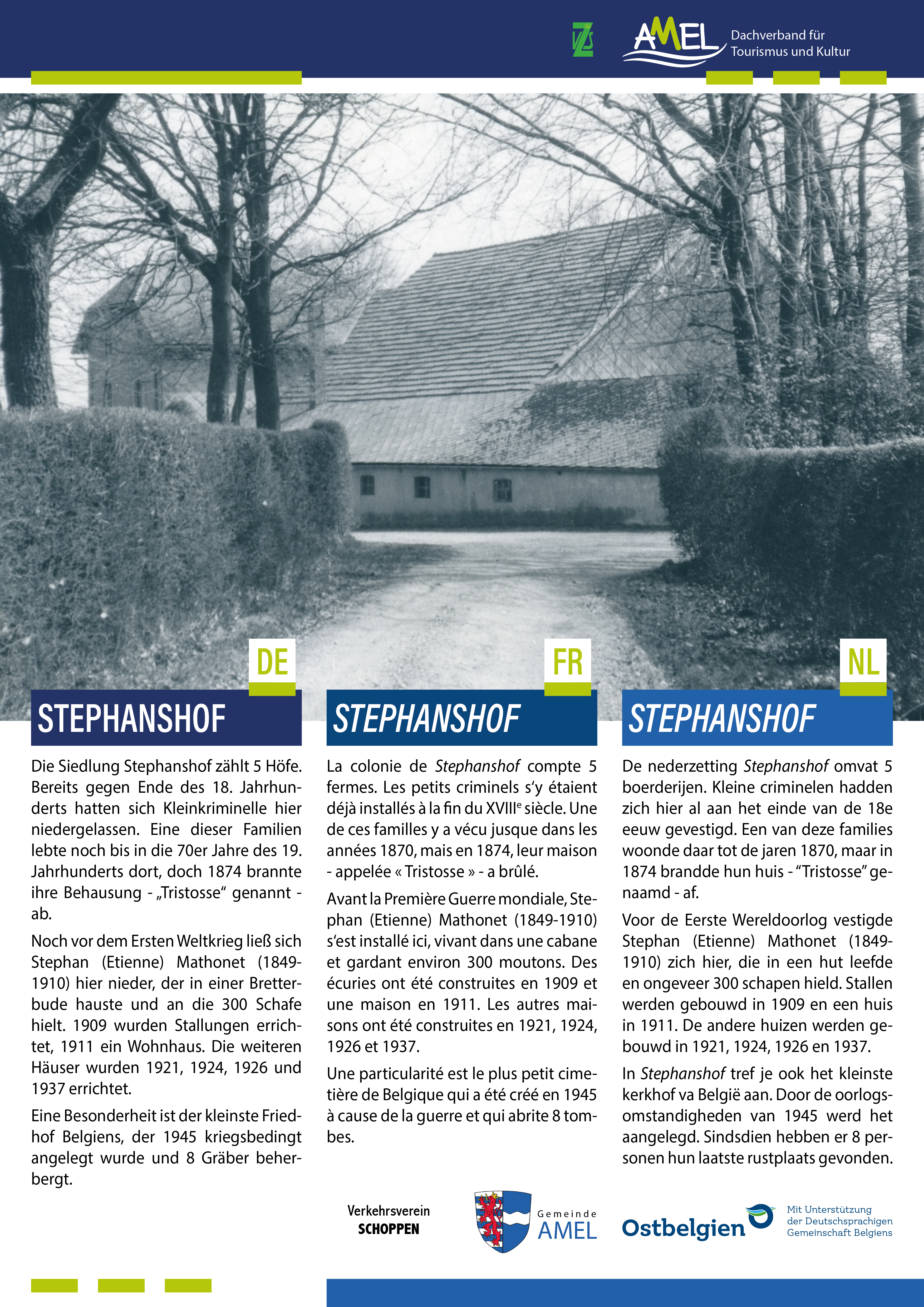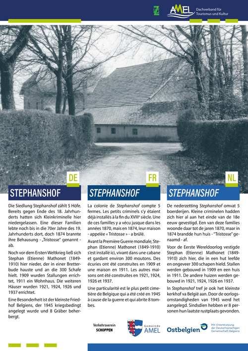SchoppenDie Siedlung Stephanshof zählt 5 Höfe. Bereits gegen Ende des 18. Jahrhunderts hatten sich Kleinkriminelle hier niedergelassen. Eine dieser Familien lebte noch bis in die 70er Jahre des 19. Jahrhunderts dort, doch 1874 brannte ihre Behausung - „Tristosse“ genannt - ab.