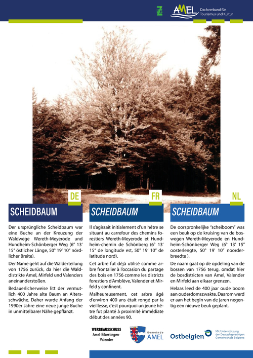 ValenderDer ursprüngliche Scheidbaum war eine Buche an der Kreuzung der Waldwege Wereth-Meyerode und Hundheim-Schönberger Weg (6° 13' 15'' östlicher Länge, 50° 19' 10'' nördlicher Breite).