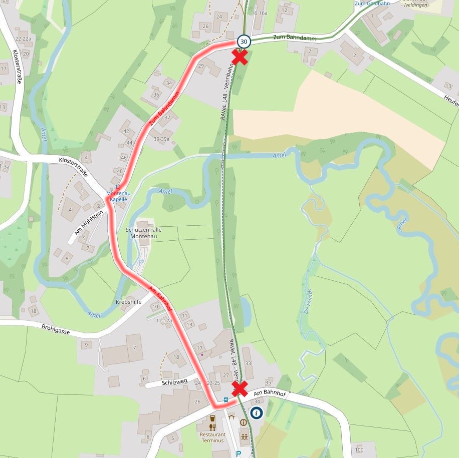 15.09.2021Anlässlich einer Schießveranstaltung des Schützenvereins Montenau wird die Vennbahn - RAVeL L48 am 18. und 19. September jeweils von 15.30 Uhr bis 18 Uhr zwischen der Kreuzung am Tourist Info und dem Knotenpunkt 30 gesperrt. Die Umleitung erfolgt über die Straßen „Am Bahnhof“ und „Zum Bahndamm“.